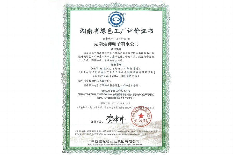 湖南省綠色工廠評價證書